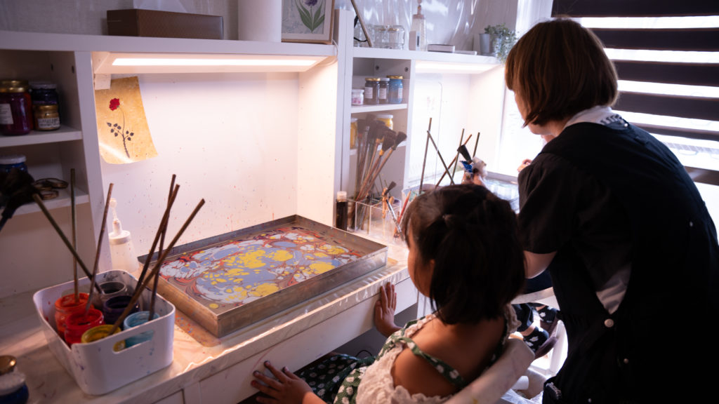水面に落としたインクをピンなどを使ってさまざまな模様を描き、紙に写しとるアートです。エブルはその技法の特殊性により、すべての作品は世界でたった一つのものとなり、2度と同じ模様を描くことはできません。