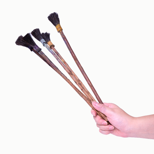 インクを水面に落とすための筆です。バラの枝を乾燥させたものと、馬のしっぽの毛を使用しており、現地から輸入した素材を使って講師が自ら作っています。とても軽く手馴染みと使い勝手のよい筆です。