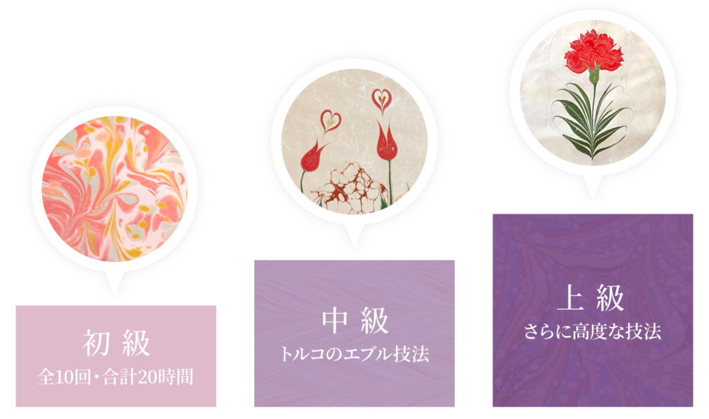 初級はテキストに従い基本的な模様の技法から、お花を描く基礎までを学んで頂きます。初級は全部で10回、合計20時間となります。 初級を修了しますと、トルコのエブルの技法である花のエブルの学習に入ります。 花は様々な種類があり、進度は人それぞれとなります。